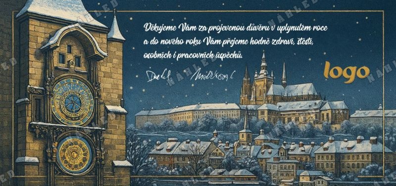 Malované novoroční přání s Pražským orlojem a hradem